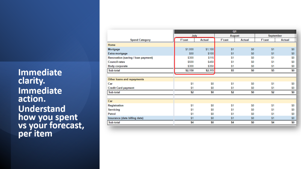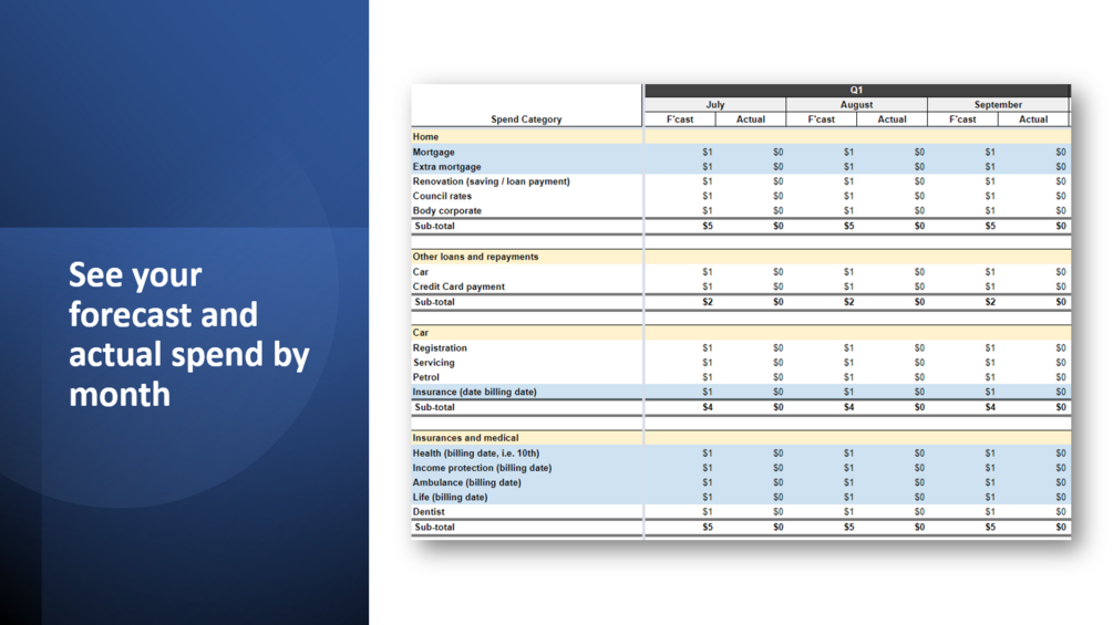 This personal budget tracker has been designed to help you avoid the 'boom bust' cycle of spending - where some months you have plenty of excess income, and other months (like when quarterly bills are due) you have much less disposable income, or may even go backwards.